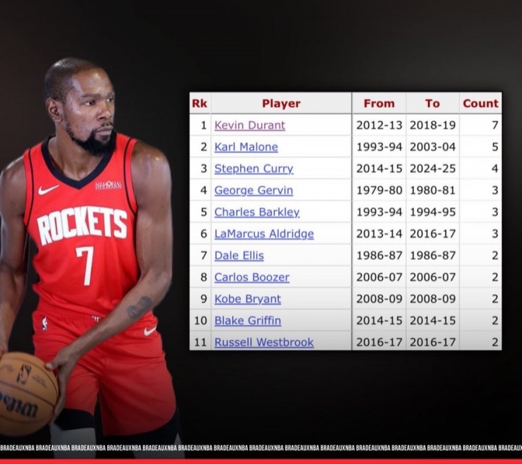 杜兰特在休斯敦对阵火箭季后赛共7次砍下30+ 为历史最多